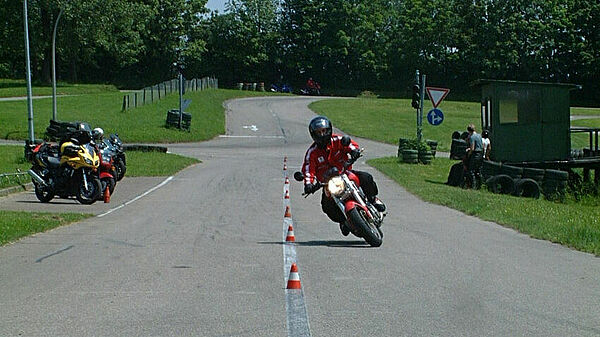- Am 2. und 3. Tag werden die erarbeiteten theoretischen Inhalte systematisch in die Praxis umgesetzt und ausgewertet. Die Fahrübungen des vpa-Motorradsicherheitstrainings werden auf unserem Übungsgelände erlernt und trainiert.